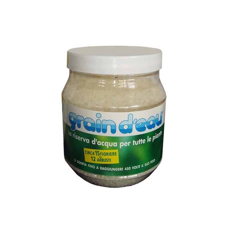 Grain d’eau è un idroretentore in granuli che una volta idratati hanno la funzione di cedere acqua alle piante riducendo del 75% le irrigazioni. Confezione da 50g.