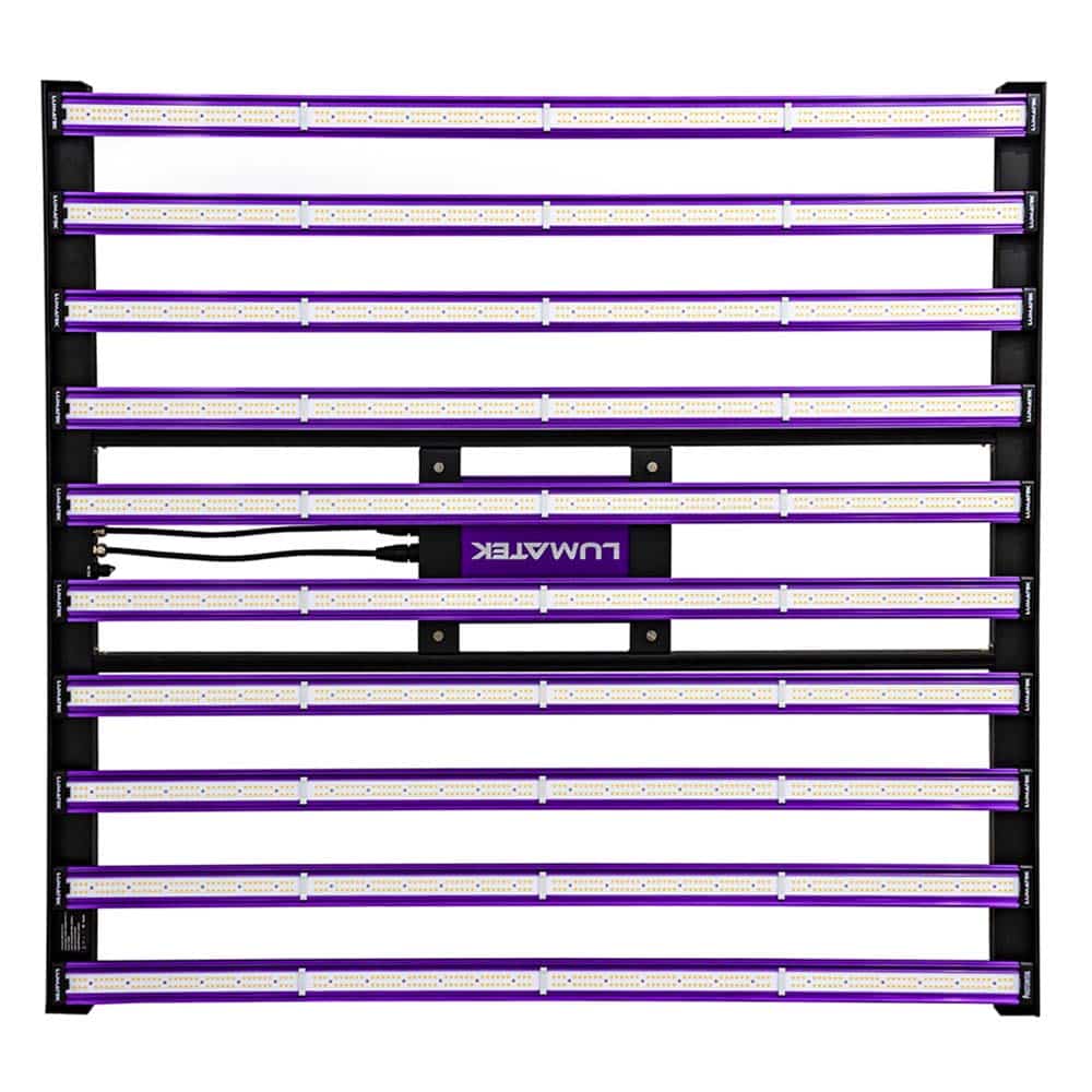 La struttura è completamente modulare e composta da dieci barre LED magnetiche facilmente rimovibili, che permettono un’installazione rapida e una manutenzione semplificata. Il sistema integra un dimmer manuale a quattro livelli (OFF-25%-50%-75%-100%) per una regolazione immediata dell’intensità luminosa, adattabile alle esigenze di ogni fase colturale. In alternativa, è possibile il controllo esterno tramite segnali 0-10 V e pannello Lumatek digitale Plus 2.0, con funzioni avanzate come regolazione automatica della luce, simulazione di alba e tramonto e gestione di interi impianti fino a 100 unità.